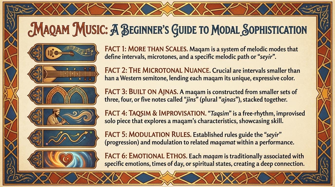 A maqam is a complete melodic framework specifying which notes to use, how to move through them, where to linger, and what emotional character to project – far more than a scale.